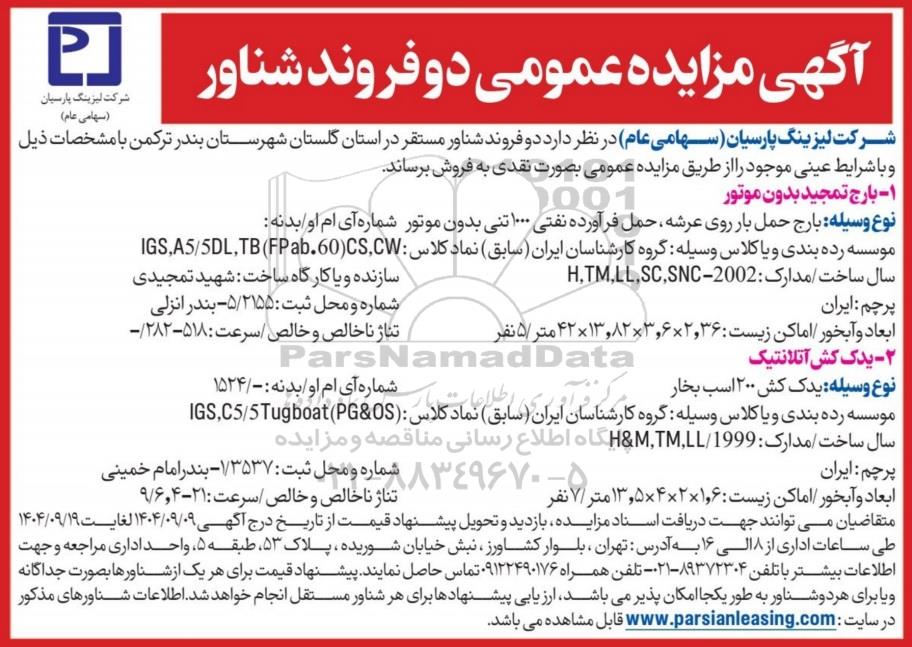 شرکت لیزینگ پارسیان (سهامی عام) در نظر دارد دو فروند شناور مستقر در استان گلستان شهرستان بندر ترکمن با مشخصات ذیل و با شرایط عینی موجود را از طریق مزایده عمومی بصورت نقدی به فروش برساند.