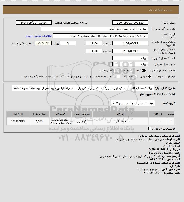 | 1 | -- | فرمالدهید | کیلوگرم | مواد شیمیایی، بیوشیمیایی و گازی | 1,500 | 1404/09/13 |
