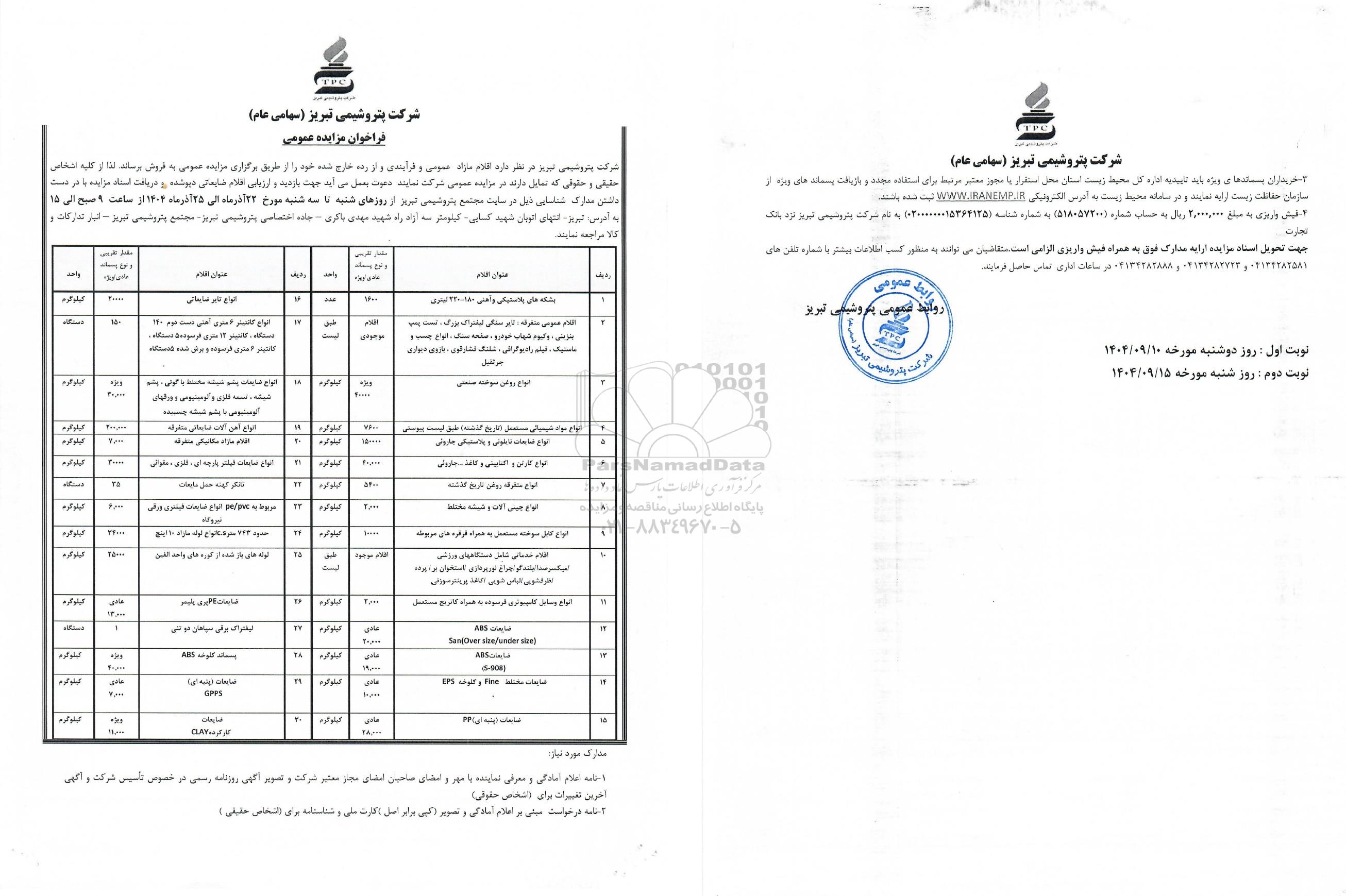 شرکت پتروشیمی تبریز در نظر دارد اقلام مازاد عمومی و فرآیندی و از رده خارج شده خود را از طریق برگزاری مزایده عمومی به فروش برساند. لذا از کلیه اشخاص حقیقی و حقوقی که تمایل دارند در مزایده عمومی شرکت نمایند دعوت به عمل می آید جهت بازدید و ارزیابی اقلام ضایعاتی دپو شده و دریافت اسناد مزایده با در دست داشتن مدارک شناسایی ذیل در سایت مجتمع پتروشیمی تبریز از روزهای شنبه تا سه شنبه مورخ 22 آذرماه الی 25 آذرماه 1404 از ساعت 9 صبح الی 15 به آدرس: تبریز- انتهای اتوبان شهید کسایی - کیلومتر سه آزادراه شهید مهدی باکری - جاده اختصاصی پتروشیمی تبریز - مجتمع پتروشیمی تبریز - انبار تدارکات و کالا مراجعه نمایند.