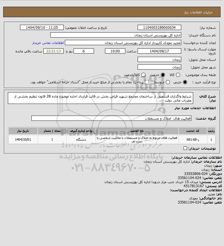 مزایده عمومی استعلام شرایط واگذاری قسمتی از ساختمان مجتمع شهید فیاض بخش در قالب قرارداد اجاره موضوع ماده 28 قانون تنظیم بخشی از مقررات مالی دولت برگزار میگردد. از کلیه افراد متخصص و شرکت‌های واجد شرایط دعوت به عمل می‌آید تا در این مزایده با کد خبرگزاری پارس نماد : 9927102 شرکت نمایند تاریخ شروع مزایده : 1404/09/10 مهلت شرکت در مزایده: تا پایان روز 1404/09/17 مکان برگزاری اموال واگذاری استان‌های مزایدات استان زنجان و دسته‌بندی‌های مربوط به این حراجی تجهیزات پزشکی, واگذاری ورزشگاه، پارکینگ، غرفه و بوفه میباشد.