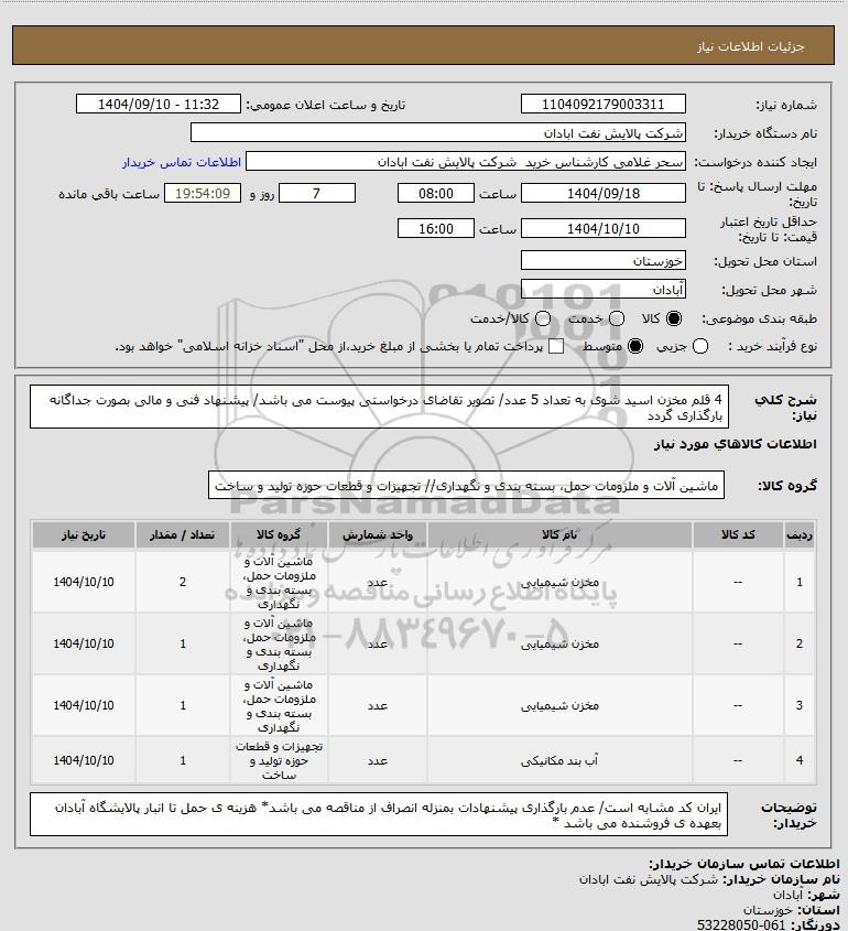 | 1 | -- | مخزن شیمیایی | عدد | ماشین آلات و ملزومات حمل، بسته بندی و نگهداری | 2 | 1404/10/10 |