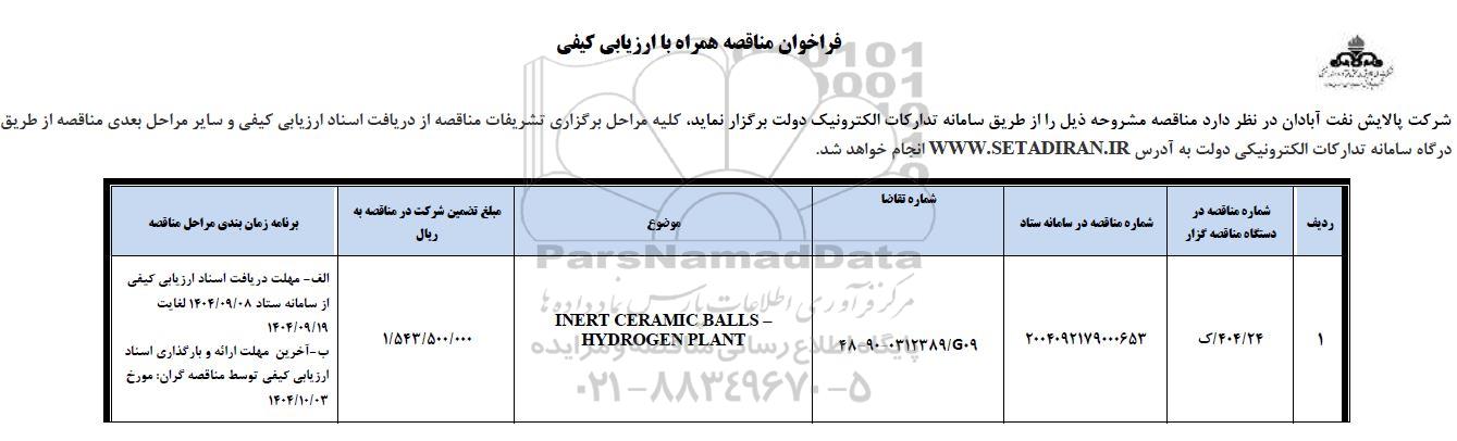 1 404/24/ک 2004092179000653 48-90-0312389/G09 INERT CERAMIC BALLS - HYDROGEN PLANT 1.543.500.000