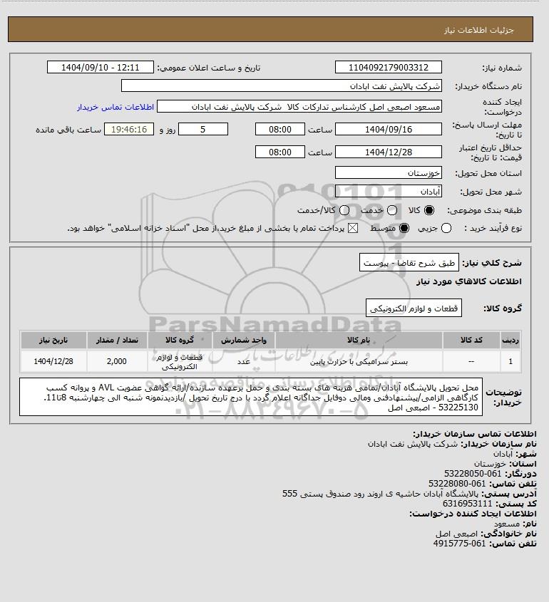| 1 | -- | بستر سرامیکی با حرارت پایین | عدد | قطعات و لوازم الکترونیکی | 2,000 | 1404/12/28 |