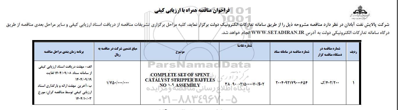 1 200 / 402 / ک 2004092179000654 S02 / 0215000070 - 90 -38 COMPLETE SET OF SPENT CATALYST STRIPPER BAFFLES NO 1-9 ASSEMBLY 1.750.000.000 الف - مهلت دریافت اسناد ارزیابی کیفی از سامانه ستاد از تاریخ 1404.9.8 لغایت 1404.9.19  ب - آخرین مهلت ارائه و بارگذاری اسناد ارزیابی کیفی توسط مناقصه گران : 1404.10.3