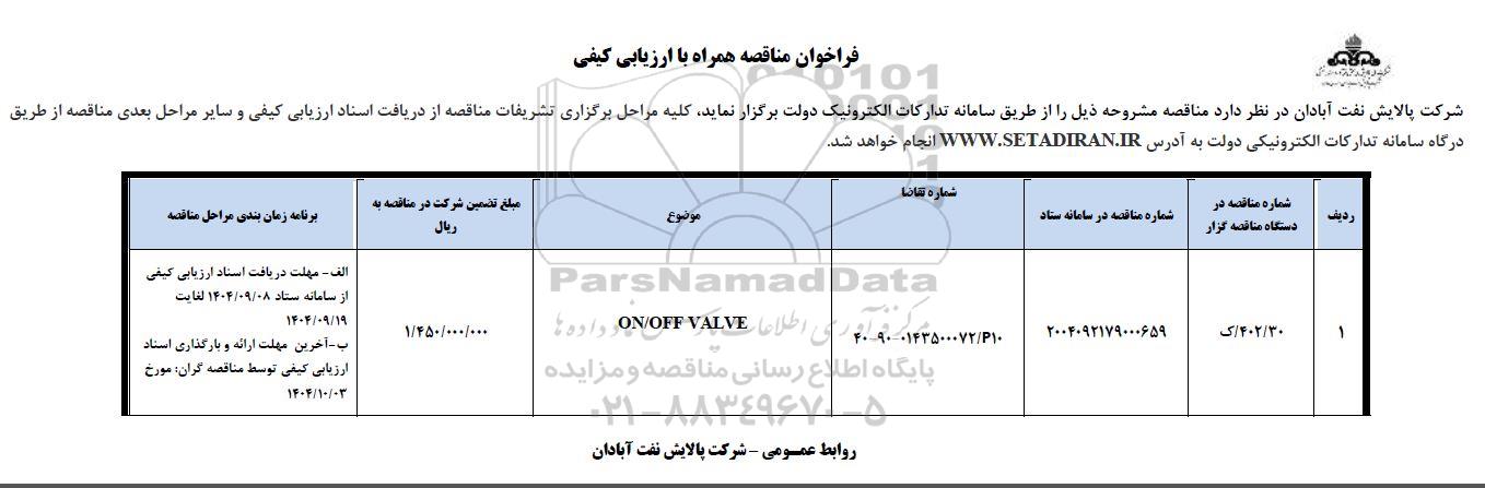 علاقهمندان میتوانند جهت دریافت اسناد و اطلاعات تکمیلی، مناقصه ON/OFF VALVE با سامانه مناقصات و مزایدات ایران پارسنماد داده ها 88349670 تماس حاصل نمایند.