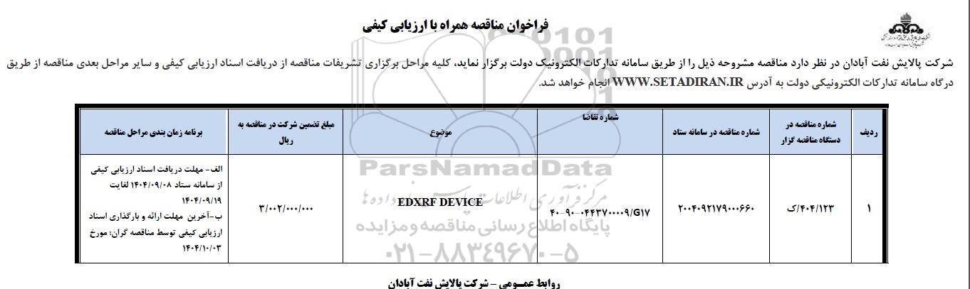 | 1 | 404/123/ ک | 2004092179000660 | 40-90-0443700009/G17 | EDXRF DEVICE | 3.002.000.000 |