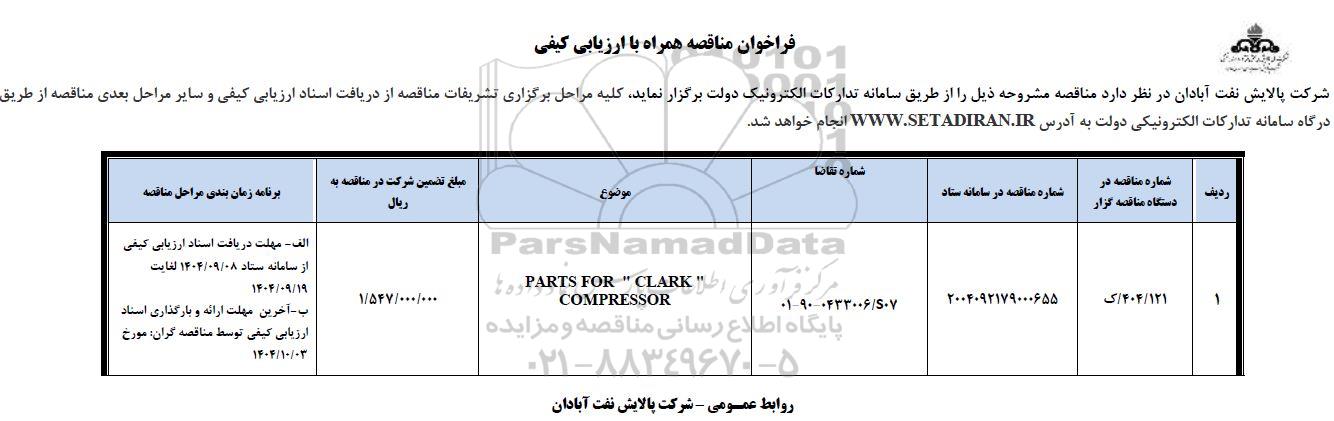 مناقصه PARTS FOR " CLARK " COMPRESSO, مناقصه PARTS FOR " CLARK " COMPRESSO