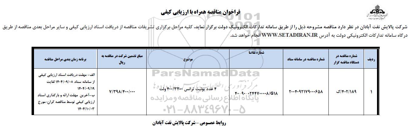 1 189/ 402 / ک 2004092179000658 40-90-0244700008/ G18 4 عدد یونیت ترانس 3300/ 400 ولت 7.398.400.000 الف - مهلت دریافت اسناد ارزیابی کیفی از سامانه ستاد از تاریخ 1404.9.8 لغایت 1404.9.19  ب - آخرین مهلت ارائه و بارگذاری اسناد ارزیابی کیفی توسط مناقصه گران : 1404.10.3