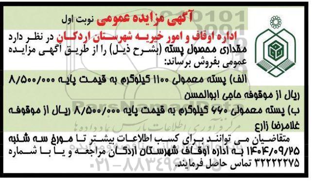 اداره اوقاف و امور خیریه شهرستان اردکان در نظر دارد مقداری محصول پسته (به شرح ذیل) را از طریق مزایده عمومی به فروش برساند: