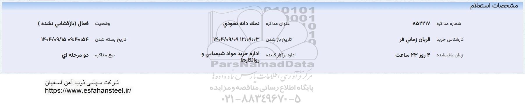 استعلام بها و موضوع استعلام استعلام خرید نمک دانه نخودی به اطلاع کلیه شرکتها و افراد متخصص واجد شرایط میرساند، آگهی گذار در نظر دارد از طریق استعلام بها، نسبت به انتخاب و دریافت پیشنهادات اقدام نماید. این استعلام با کد آگهی ثبت شده در سامانه خبرگزاری پارس نماد : 9928663 منتشر شده است. مشخصات استعلام : تاریخ شروع استعلام: 1404/09/10 آخرین مهلت ارسال پیشنهاد قیمت : 1404/09/15 و محل اجرای پروژه : استان مناقصات استان اصفهان میباشد. استعلام قیمت مورد درخواست : استعلام خرید نمک دانه نخودی با دستهبندیهای تخصصی و گروه های مرتبط : مواد معدنی, نمک, مواد اولیه کارخانجات, استعلام اطلاع رسانی میگردد.