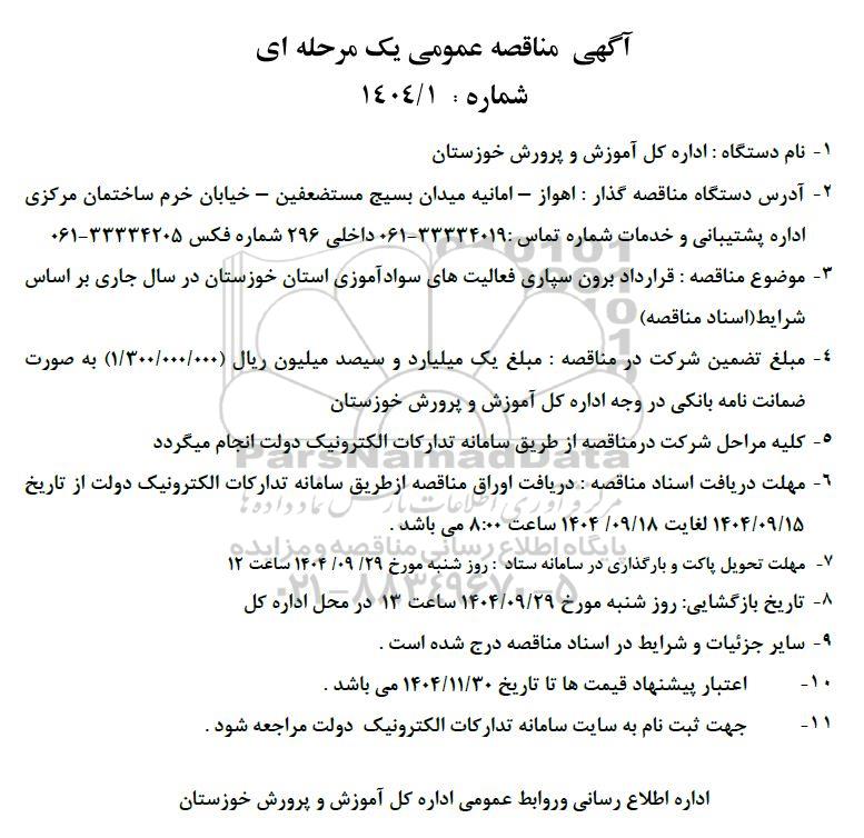 3 موضوع مناقصه : قرارداد برون سپاری فعالیت های سواد آموزی استان خوزستان در سال جاری بر اساس شرایط اسناد مناقصه