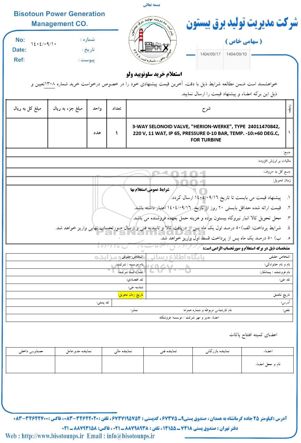 استعلام بها و موضوع استعلام استعلام خرید سلونویید ولو به اطلاع کلیه شرکتها و افراد متخصص واجد شرایط میرساند، آگهی گذار در نظر دارد از طریق استعلام بها، نسبت به انتخاب و دریافت پیشنهادات اقدام نماید. این استعلام با کد آگهی ثبت شده در سامانه خبرگزاری پارس نماد : 9929227 منتشر شده است. مشخصات استعلام : تاریخ شروع استعلام: 1404/09/10 آخرین مهلت ارسال پیشنهاد قیمت : 1404/09/17 و محل اجرای پروژه : استان مناقصات استان کرمانشاه , مناقصات استان تهران میباشد. استعلام قیمت مورد درخواست : استعلام خرید سلونویید ولو با دستهبندیهای تخصصی و گروه های مرتبط : شیرآلات, نیروگاه, تجهیزات برق و الکترونیک, استعلام اطلاع رسانی میگردد.