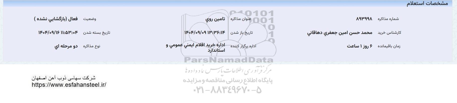 استعلام بها و موضوع استعلام استعلام تامین روی به اطلاع کلیه شرکتها و افراد متخصص واجد شرایط میرساند، آگهی گذار در نظر دارد از طریق استعلام بها، نسبت به انتخاب و دریافت پیشنهادات اقدام نماید. این استعلام با کد آگهی ثبت شده در سامانه خبرگزاری پارس نماد : 9929228 منتشر شده است. مشخصات استعلام : تاریخ شروع استعلام: 1404/09/10 آخرین مهلت ارسال پیشنهاد قیمت : 1404/09/16 و محل اجرای پروژه : استان مناقصات استان اصفهان میباشد. استعلام قیمت مورد درخواست : استعلام تامین روی با دستهبندیهای تخصصی و گروه های مرتبط : ساخت،نصب و تعمیرات صنایع فولاد, قطعات مس و برنج, مواد اولیه کارخانجات, استعلام اطلاع رسانی میگردد.