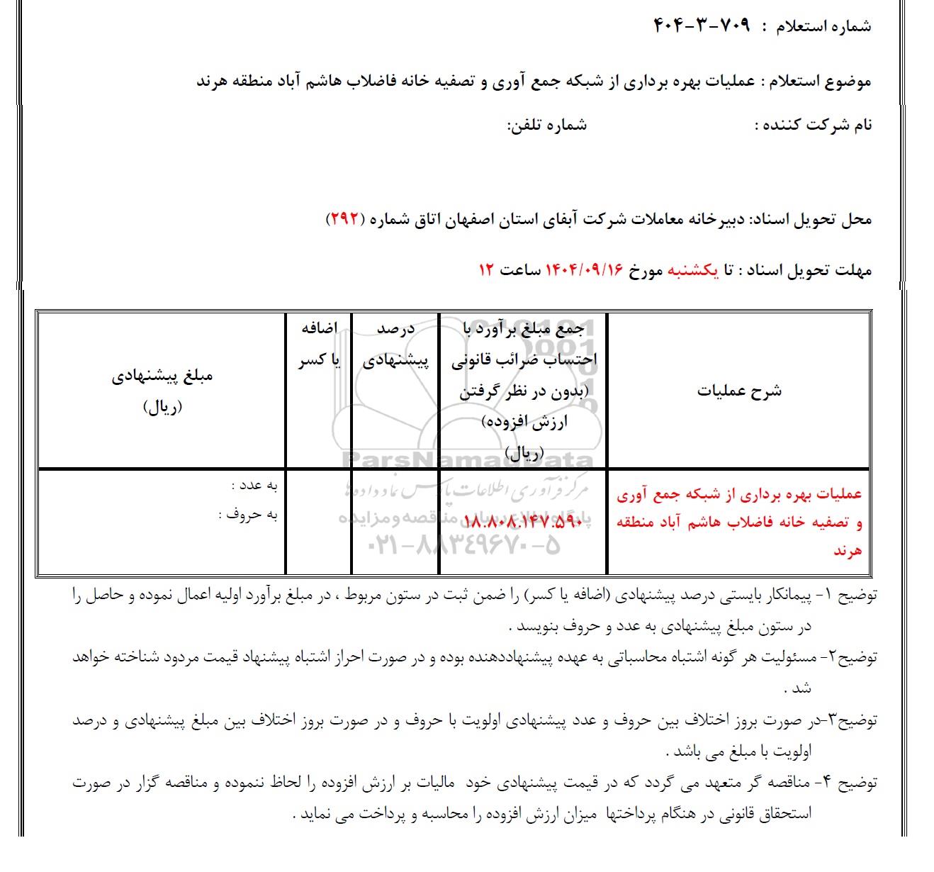 موضوع استعلام : عملیات بهره برداری از شبکه جمع آوری و تصفیه خانه فاضلاب هاشم آباد منطقه هرند
