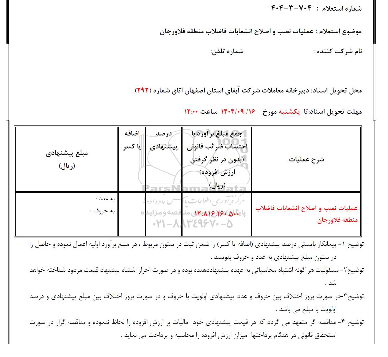 موضوع استعلام: عملیات نصب و اصلاح انشعابات فاضلاب منطقه فلاورجان