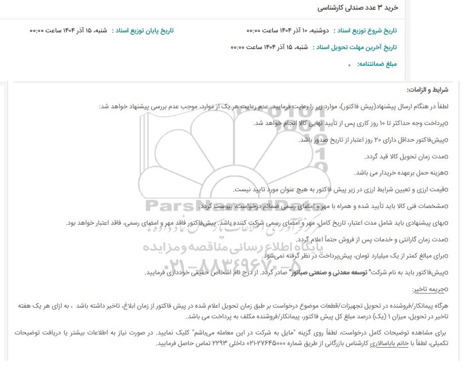 در صورت نیاز به دریافت راهنمایی یا پشتیبانی در خصوص استعلام و مناقصه و فراخوان مناقصه عمومی، مناقصه محدود، مناقصه بین المللی، مناقصه دولتی، مناقصه خصوصی، مناقصه آنلاین فروش تجهیزات، مناقصه مشاورهای مناقصه پتروشیمی و انرژی مناقصه صنایع و تجهیزات برق و مخابرات و نفت و گاز ... لطفاً با سایت خبری مناقصه و مزایده پارسنماد دادهها به شماره 88349670 تماس حاصل فرمایید.