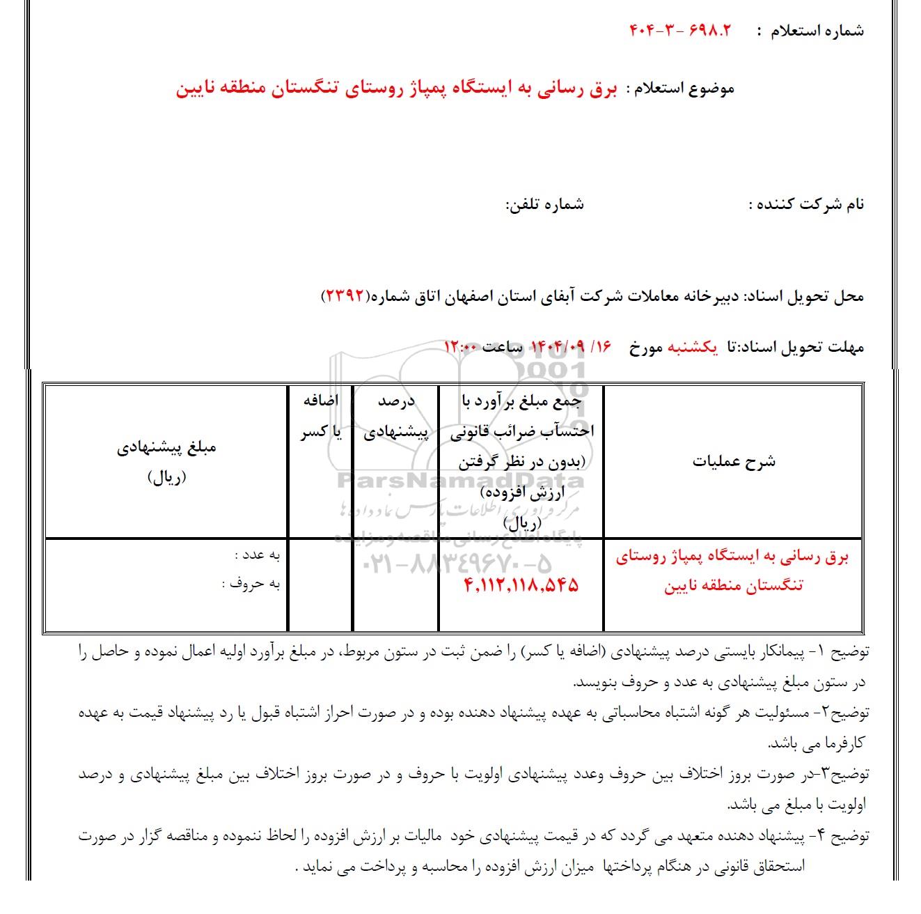 موضوع استعلام : برق رسانی به ایستگاه پمپاژ روستای تنگستان منطقه نایین