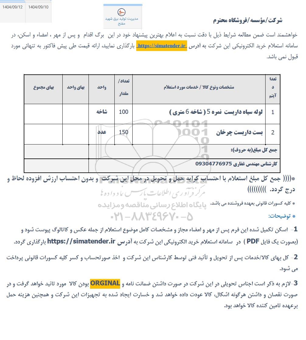 خواهشمند است ضمن مطالعه شرایط ذیل با دقت نسبت به اعلام بهترین پیشنهاد خود در این برگ اقدام و پس از مهر و امضاء و اسکن در سامانه استعلام خرید الکترونیکی این شرکت به آدرس https://simatender.ir بارگذاری نمایید. ارائه قیمت طی پیش فاکتور به تنهائی مورد قبول نمی باشد.