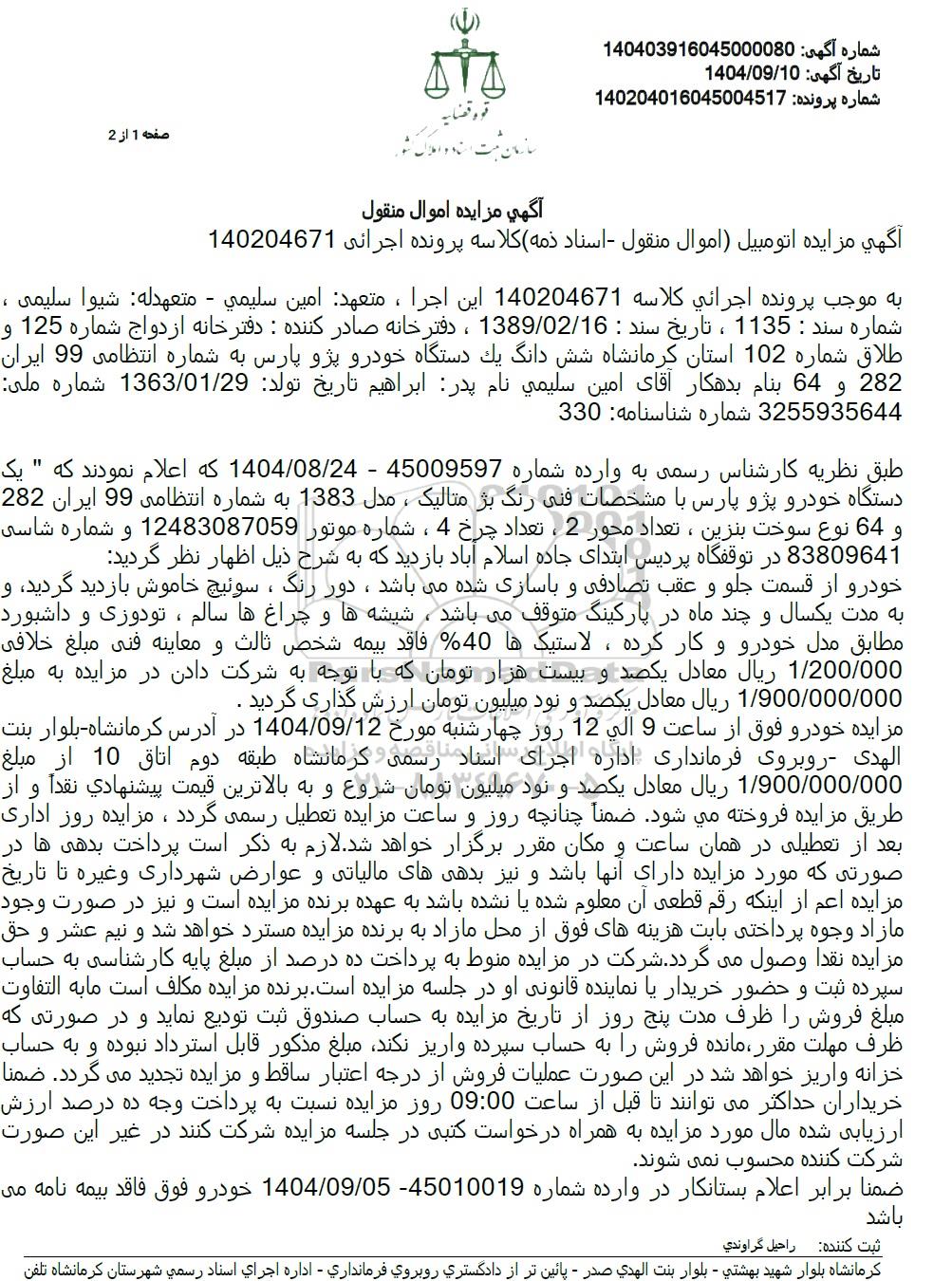 آگهی مزایده اتومبیل (اموال منقول - اسناد ذمه) کلاسه پرونده اجرائی 140204671