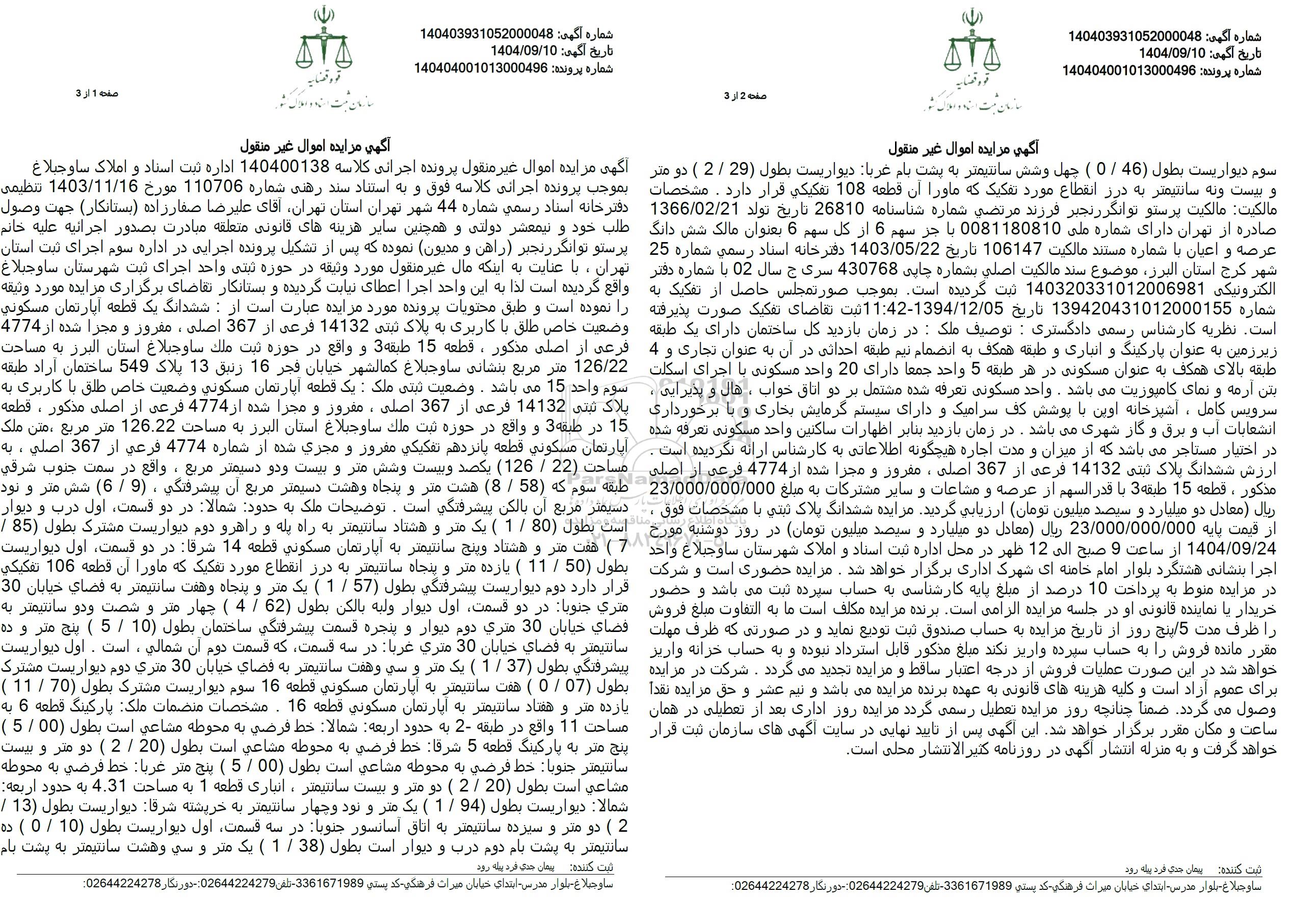 تاریخ مزایده 1404.9.24 از ساعت 9 الی 12 در محل اداره ثبت اسناد و املاک شهرستان ساوجبلاغ