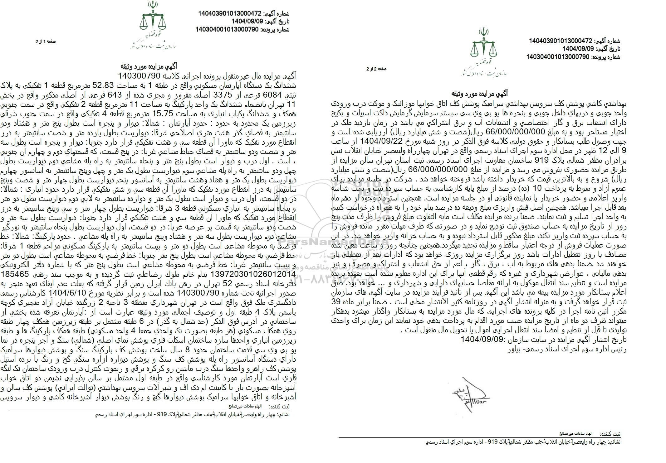مزایده فروش ششدانگ یک دستگاه آپارتمان مسکونی واقع در طبقه 1 به مساحت 52.83 متر مربع, مزایده فروش ششدانگ یک دستگاه آپارتمان مسکونی واقع در طبقه 1 به مساحت 52.83 متر مربع