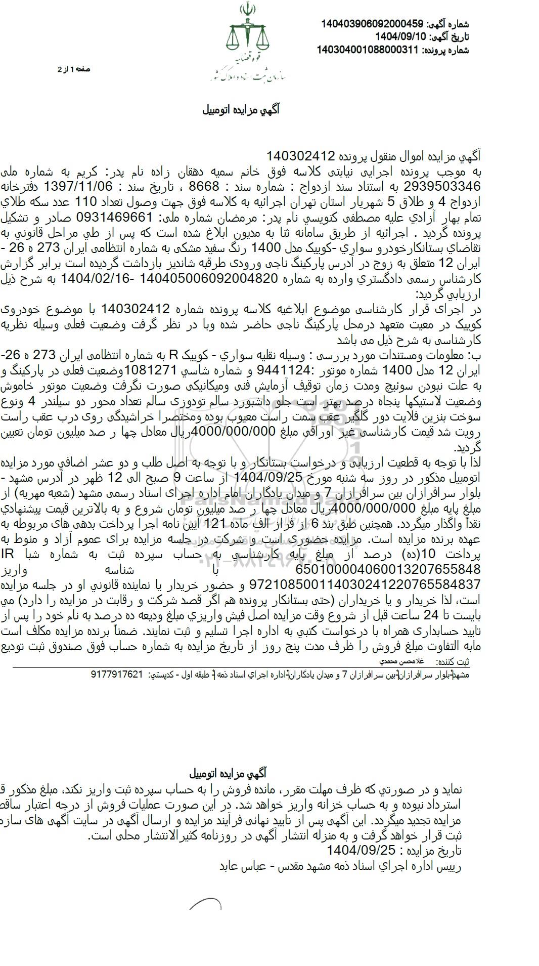 به موجب پرونده اجرایی نیابتی کلاسه فوق خانم سمیه دهقان زاده نام پدر کریم به شماره ملی 2939503346 به استناد سند ازدواج : شماره سند : 8668 ، تاریخ سند : 1397.11.06 دفتر خانه ازدواج 4 و طلاق 5 شهریار استان تهران اجرائیه به کلاسه فوق جهت وصول تعداد 110 عدد سکه طلای تمام بهار آزادی علیه مصطفى کنویسی نام پدر مرمضان شماره ملی 0931469661 صادر و تشکیل پرونده گردید، اجرائیه از طریق سامانه تنا به مدیون ابلاغ شده است که پس از طی مراحل قانونی به تقاضای بستانکار خودرو سواری کوییک مدل 1400 رنگ سفید مشکی به شماره انتظامی ایران 273 ه 26 -ایران 12 متعلق به زوج در آدرس پارکینگ ناجی ورودی طرقبه شاندیز بازداشت گردیده است برابر گزارش کارشناس رسمی دادگستری وارده به شماره 140405006092004820 - 1404.02.16 به شرح ذیل ارزیابی گردید