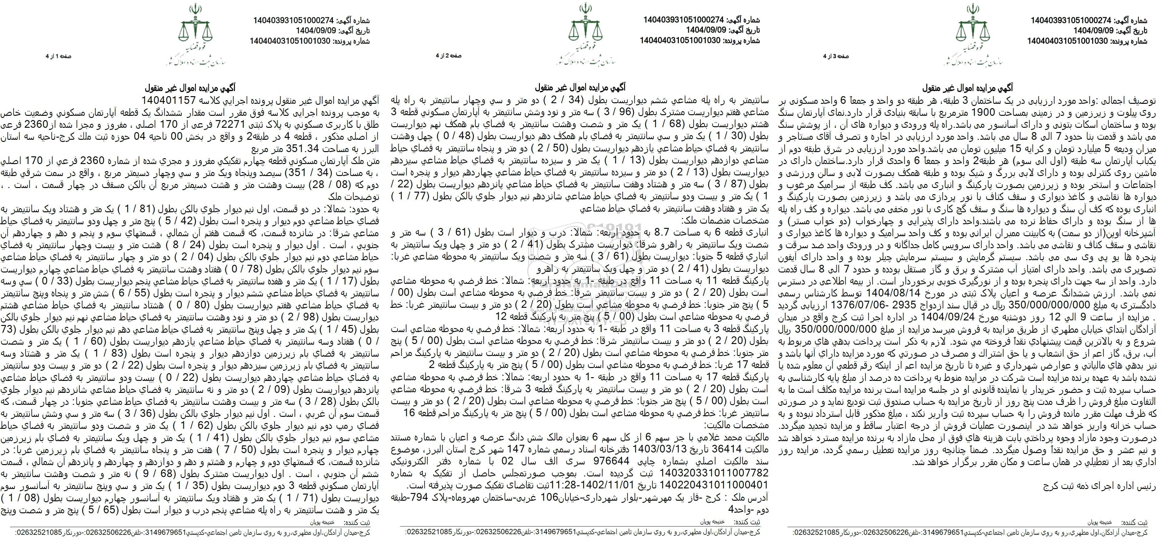 مزایده روز دوشنبه مورخ 1404.9.24 از ساعت 9 الی 12 در محل اجرای ثبت کرج