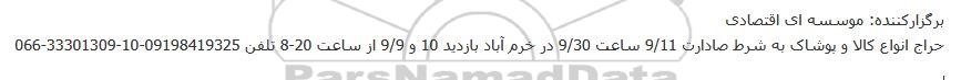 حراج انواع کالا و پوشاک به شرط صادارت 9/11 ساعت 9/30 در خرم آباد بازدید 10 و 9/9 از ساعت 20-8 تلفن 09198419325-10-33301309-066