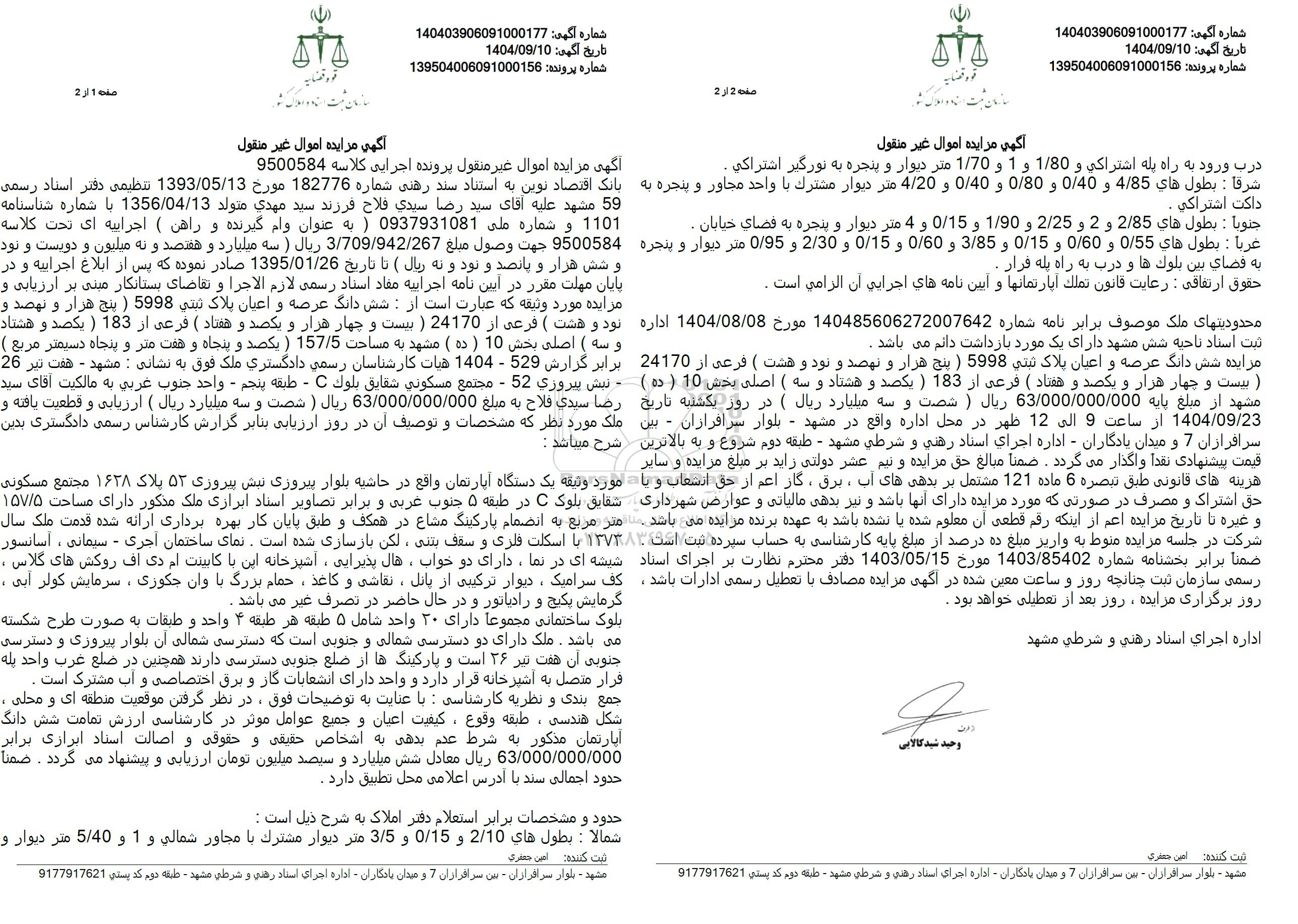 آگهی مزایده اموال غیر منقول پرونده اجرایی کلاسه 9500584