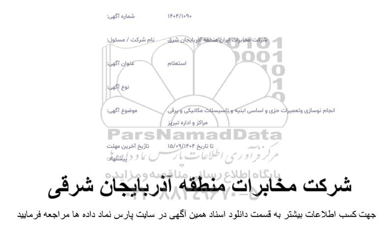موضوع آگهی نوسازی و تعمیرات جزئی و اساسی ابنیه و تاسیسات مکانیکی و برقی مراکز و ادارات تبریز