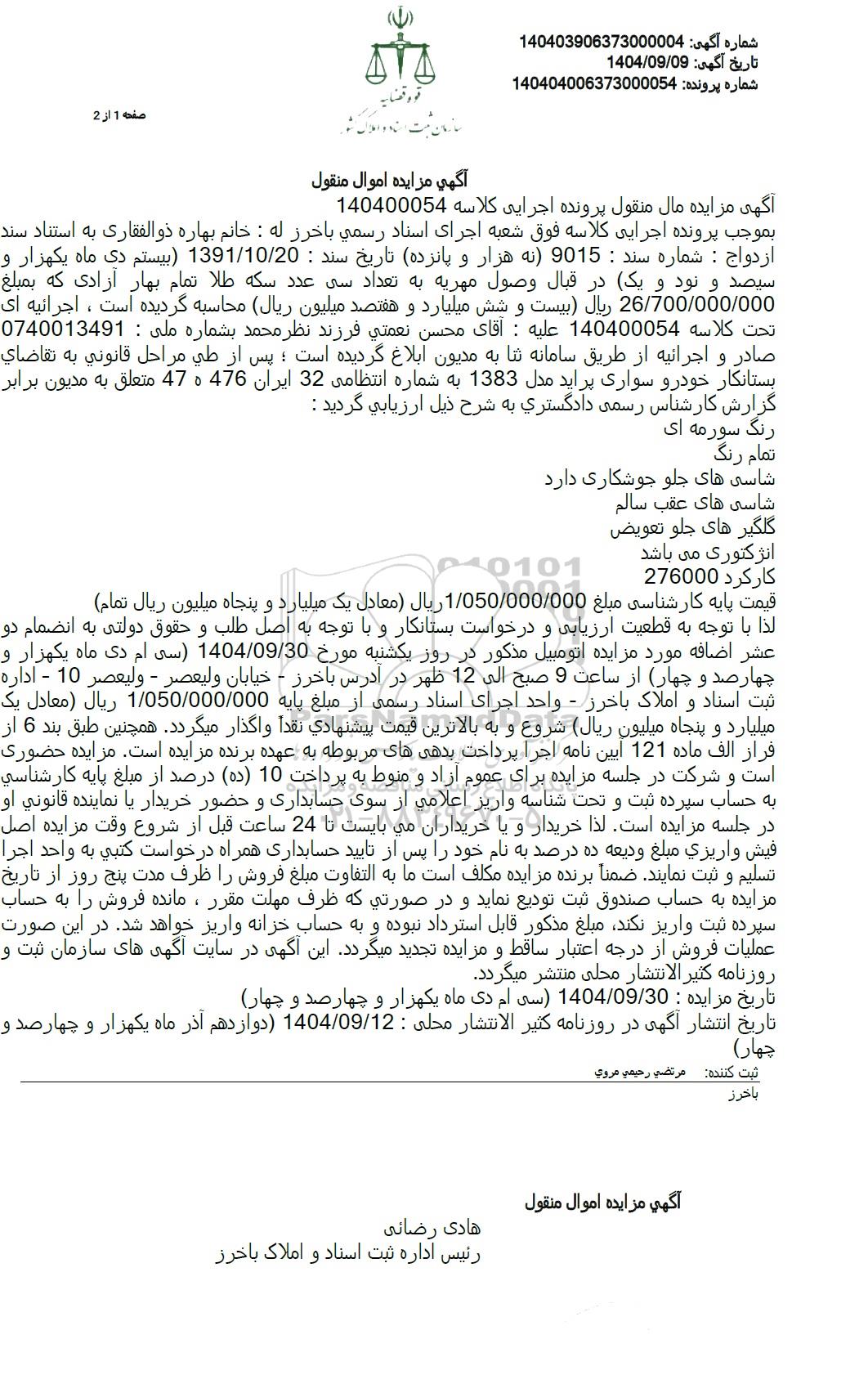بموجب پرونده اجرایی کلاسه فوق شعبه اجرای اسناد رسمی باخرز له : خانم بهاره ذوالفقاری به استناد سند ازدواج : شماره سند : 9015 نه هزار و پانزده تاریخ سند : 1391.10.20 بیستم دی ماه یکهزار و سیصد و نود و یک در قبال وصول مهریه به تعداد سی عدد سکه طلا تمام بهار آزادی که بمبلغ 26.700.000.000 ریال بیست و شش میلیارد و هفتصد میلیون ریال محاسبه گردیده است ، اجرائیه ای تحت کلاسه 140400054 علیه : آقای محسن نعمتی فرزند نظر محمد بشماره ملی : 0740013491 صادر و اجرائیه از طریق سامانه ثنا به مدیون ابلاغ گردیده است ؛ پس از از طی مراحل قانونی به تقاضای بستانکار خودرو سواری پراید مدل 1383 به شماره انتظامی 32 ایران 476 470 متعلق به مدیون برابر گزارش کارشناس رسمی دادگستری به شرح ذیل ارزیابی گردید :