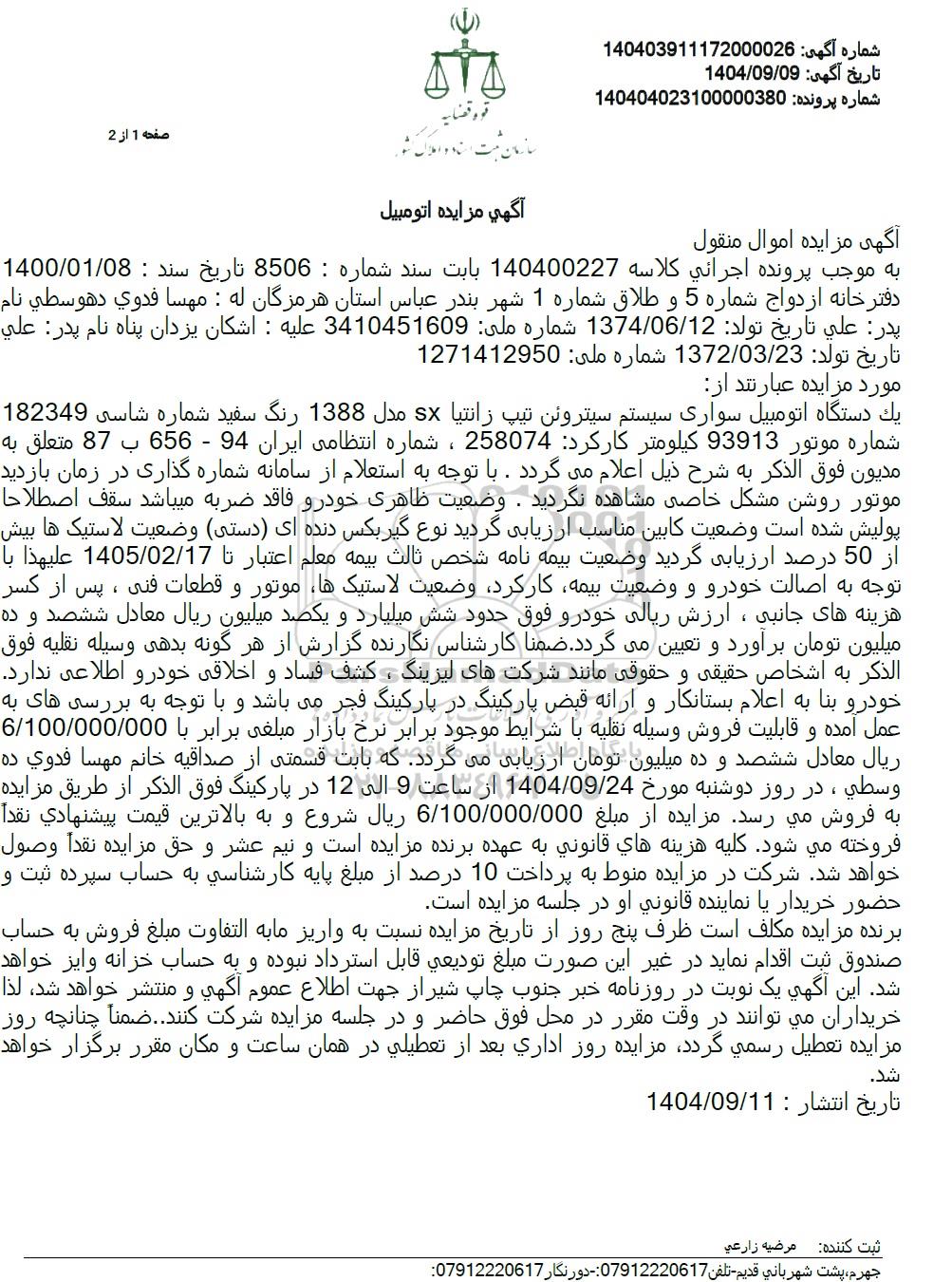 یک دستگاه اتومبیل سواری سیستم سیتروئن تیپ زانتیا مدل 1388 رنگ سفید شماره شاسی 182349 شماره موتور 93913 کیلومتر کار کرد 258074 ، شماره انتظامی ایران 94 - 656 ب 87 متعلق به مدیون فوق الذکر به شرح ذیل اعلام میگردد. با توجه به استعلام از سامانه شماره گذاری در زمان بازدید موتور روشن مشکل خاصی مشاهده نگردید. وضعیت ظاهری خودرو فاقد ضربه میباشد سقف اصطلاحا پولیش شده است وضعیت کابین مناسب ارزیابی گردید نوع گیربکس دنده ای (دستی) وضعیت لاستیک ها بیش از 50 درصد ارزیابی گردید وضعیت بیمه نامه شخص ثالث بیمه معلم اعتبار تا 1405.02.17 علیهذا با توجه به اصالت خودرو و وضعیت بیمه کارکرد وضعیت لاستیکها موتور و قطعات فنی ، پس از کسر هزینه های جانبی ، ارزش ریالی خودرو فوق حدود شش میلیارد و یکصد میلیون ریال معادل ششصد و ده میلیون تومان برآورد و تعیین میگردد. ضمنا کارشناس نگارنده گزارش از هر گونه بدهی وسیله نقلیه فوق الذكر به اشخاص حقیقی و حقوقی مانند شرکتهای لیزینگ ، کشف فساد و اخلاقی خودرو اطلاعی ندارد. خودرو بنا به اعلام بستانکار و ارائه قبض پارکینگ در پارکینگ فجر میباشد و با توجه به بررسی های به عمل آمده و قابلیت فروش وسیله نقلیه با شرایط موجود برابر نرخ بازار مبلغی برابر با 6.100.000.000 ریال معادل ششصد و ده میلیون تومان ارزیابی میگردد که بابت قسمتی از صداقیه خانم مهسا فدوی ده وسطی ، در روز دوشنبه مورخ 1404.09.24 از ساعت 9 الی 12 در پارکینگ فوق الذکر از طریق مزایده به فروش می رسد. مزایده از مبلغ 6.100.000.000 ریال شروع و به بالاترین قیمت پیشنهادی نقدا فروخته می شود. کلیه هزینه های قانونی به عهده برنده مزایده است و نیم عشر و حق مزایده نقداً وصول خواهد شد شرکت در مزایده منوط به پرداخت 10 درصد از مبلغ پایه کارشناسی به حساب سپرده ثبت و حضور خریدار یا نماینده قانونی او در جلسه مزایده است.
