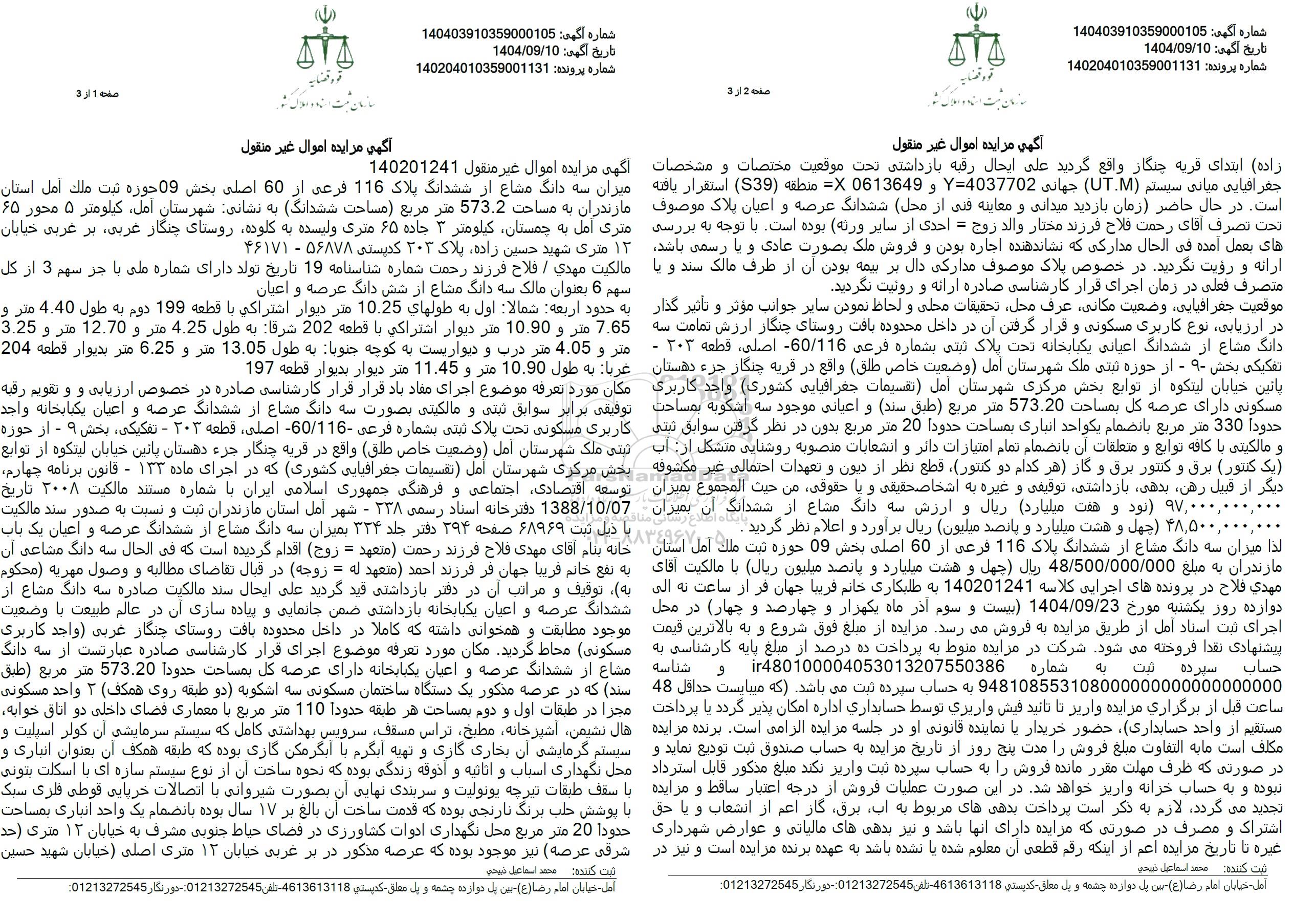 مزایده میزان سه دانگ مشاع از ششدانگ پلاک 116 فرعی از 60 اصلی بخش 09 , مزایده میزان سه دانگ مشاع از ششدانگ پلاک 116 فرعی از 60 اصلی بخش 09