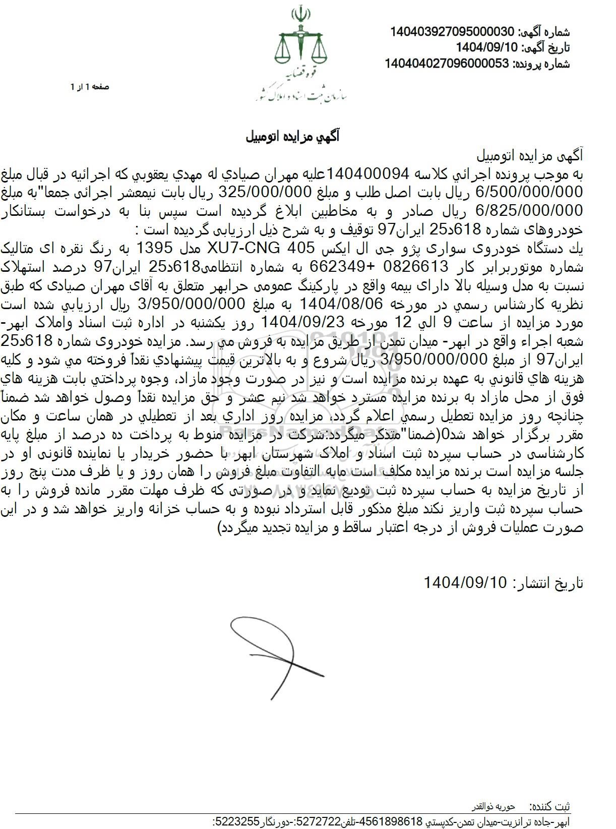 یک دستگاه خودروی سواری پژو جی ال ایکس 405 XU7-CNG مدل 1395 به رنگ نقره ای متالیک شماره موتور برابر کار 0826613 662349 به شماره انتظامی 618د 25 ایران 97 درصد استهلاک نسبت به مدل وسیله بالا دارای بیمه واقع در پارکینگ عمومی حرابهر متعلق به آقای مهران صیادی که طبق نظریه کارشناس رسمی در مورخه 1404.08.06 به مبلغ 3.950.000.000 ریال ارزیابی شده است. مورد مزایده از ساعت 9 الی 12 مورخه 1404.09.23 روز یکشنبه در اداره ثبت اسناد و املاک ابهر شعبه اجراء واقع در ابهر میدان تمدن از طریق مزایده به فروش می رسد. مزایده خودروی شماره 252618 ایران 97 از مبلغ 3.950.000.000 ریال شروع و به بالاترین قیمت پیشنهادی نقدا فروخته می شود و کلیه هزینه های قانونی به عهده برنده مزایده است و نیز در صورت وجود مازاد وجوه پرداختی بابت هزینه های فوق از محل مازاد به برنده مزایده مسترد خواهد شد نیم عشر و حق مزایده نقداً وصول خواهد شد ضمنا چنانچه روز مزایده تعطیل رسمی اعلام گردد مزایده روز اداری بعد از تعطیلی در همان ساعت و مکان مقرر برگزار خواهد شد ضمنا متذکر میگردد شرکت در مزایده منوط به پرداخت ده درصد از مبلغ پایه کارشناسی در حساب سپرده ثبت اسناد و املاک شهرستان ابهر با حضور خریدار یا نماینده قانونی او در جلسه مزایده است برنده مزایده مکلف است مابه التفاوت مبلغ فروش را همان روز و یا ظرف مدت پنج روز از تاریخ مزایده به حساب سپرده ثبت تودیع نماید و در صورتی که ظرف مهلت مقرر مانده فروش را به حساب سپرده ثبت واریز نکند مبلغ مذکور قابل استرداد نبوده و به حساب خزانه واریز خواهد شد و در این صورت عملیات فروش از درجه اعتبار ساقط و مزایده تجدید میگردد