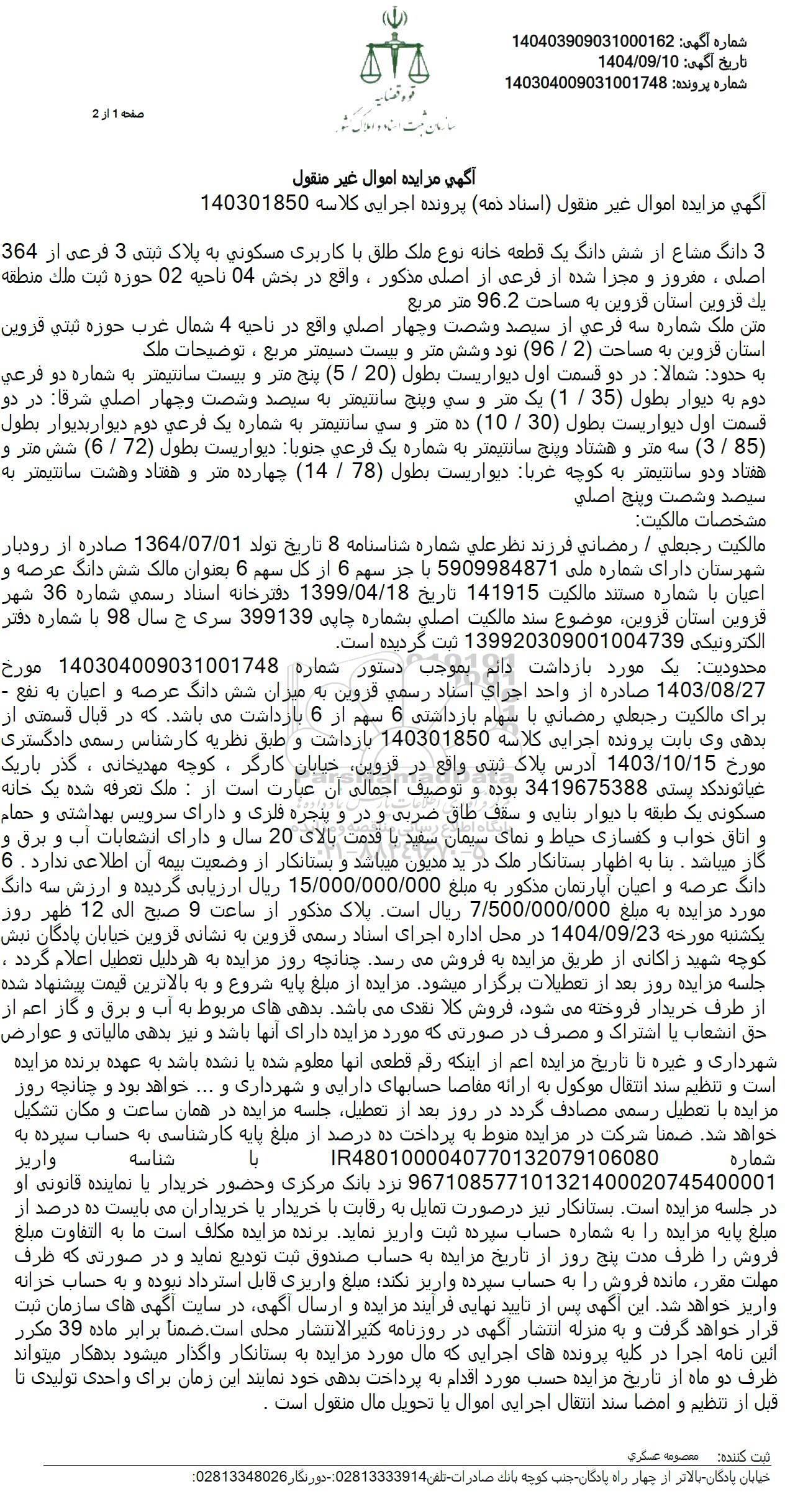 محدودیت یک مورد بازداشت دائم بموجب دستور شماره 140304009031001748 مورخ 1403.08.27 صادره از واحد اجرای اسناد رسمی قزوین به میزان شش دانگ عرصه و اعیان به نفع -برای مالکیت رجبعلی رمضانی با سهام بازداشتی 6 سهم از 6 بازداشت می باشد که در قبال قسمتی از بدهی وی بابت پرونده اجرایی کلاسه 140301850 بازداشت و طبق نظریه کارشناس رسمی دادگستری مورخ 1403.10.15 آدرس پلاک ثبتی واقع در قروین خیابان کارگر، کوچه مهدیخانی ، گذر باریک غیاتوند کد پستی 3419675388 بوده و توصیف اجمالی آن عبارت است از: ملک تعرفه شده یک خانه مسکونی یک طبقه با دیوار بنایی و سقف طاق ضربی و در و پنجره فلزی و دارای سرویس بهداشتی و حمام و اتاق خواب و کفسازی حیاط و نمای سیمان سفید با قدمت بالای 20 سال و دارای انشعابات آب و برق و گار میباشد . بنا به اظهار بستانکار ملک در ید مدیون میباشد و بستانکار از وضعیت بیمه آن اطلاعی ندارد . 6 دانگ عرصه و اعیان آپارتمان مذکور به مبلغ 15.000.000.000 ریال ارزیابی گردیده و ارزش سه دانگ مورد مزایده به مبلغ 7.500.000.000 ریال است. پلاک مذکور از ساعت 9 صبح الى 12 ظهر روز یکشنبه مورخه 1404.09.23 در محل اداره اجرای اسناد رسمی قزوین به نشانی قزوین خیابان پادگان نبش کوچه شهید راکانی از طریق مزایده به فروش میرسد چنانچه روز مزایده به هر دلیل تعطیل اعلام گردد . جلسه مزایده روز بعد از تعطیلات برگزار میشود. مزایده از مبلغ پایه شروع و به بالاترین قیمت پیشنهاد شده از طرف خریدار فروخته میشود فروش کلا نقدی می باشد. بدهی های مربوط به آب و برق و گاز اعم از حق انشعاب یا اشتراک و مصرف در صورتی که مورد مزایده دارای آنها باشد و نیز بدهی مالیاتی و عوارض شهرداری و غیره تا تاریخ مزایده اعم از اینکه رقم قطعی آنها معلوم شده یا نشده باشد به عهده برنده مزایده است و تنظیم سند انتقال موکول به ارائه مقاضا حسابهای دارایی و شهرداری و .... خواهد بود و چنانچه روز مزایده با تعطیل رسمی مصادف گردد در روز بعد از تعطیل جلسه مزایده در همان ساعت و مکان تشکیل خواهد شد. ضمنا شرکت در مزایده منوط به پرداخت ده درصد از مبلغ پایه کارشناسی به حساب سپرده به IR4801000040770132079106080 شماره شناسه واریز 967108577101321400020745400001 درد بانک مرکزی و حضور خریدار یا نماینده قانونی او در جلسه مزایده است. بستانکار نیز در صورت تمایل به رقابت با خریدار با خریداران می بایست ده درصد از مبلغ پایه مزایده را به شماره حساب سپرده ثبت واریز نماید برنده مزایده مکلف است ما به التفاوت مبلغ فروش را ظرف مدت پنج روز از تاریخ مزایده به حساب صندوق ثبت تودیع نماید و در صورتی که ظرف مهلت مقرر مانده فروش را به حساب سپرده واریز نکند مبلغ واریزی قابل استرداد نبوده و به حساب خرانه واریز خواهد شد. این آگهی پس از تایید نهایی فرآیند مزایده و ارسال آگهی در سایت آگهی های سازمان ثبت قرار خواهد گرفت و به منزله انتشار آگهی در روزنامه کثیر الانتشار محلی است. ضمنا برابر ماده 39 مکرر ائین نامه اجرا در کلیه پرونده های اجرایی که مال مورد مزایده به بستانکار واگذار میشود بدهکار میتواند ظرف دو ماه از تاریخ مزایده حسب مورد اقدام به پرداخت بدهی خود نمایند این زمان برای واحدی تولیدی تا قبل از تنظیم و امضا سند انتقال اجرایی اموال با تحویل مال منقول است.