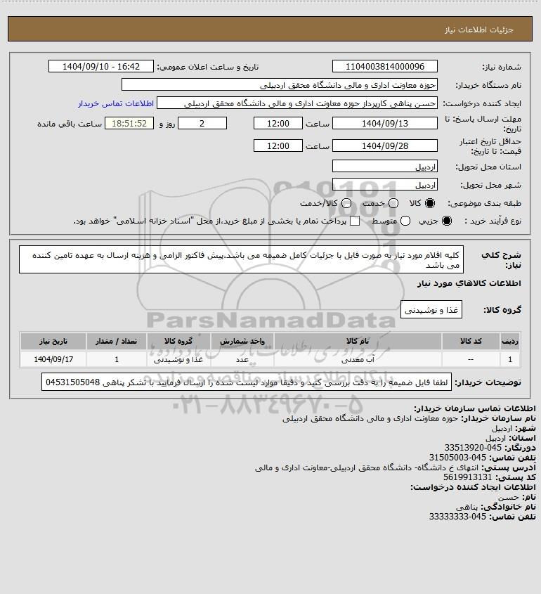 استعلام بها و موضوع استعلام استعلام کلیه اقلام مورد نیاز به صورت فایل با جزئیات کامل ضمیمه می باشد.پیش فاکتور الزامی و هزینه ارسال به عهده تامین کننده می باشد به اطلاع کلیه شرکتها و افراد متخصص واجد شرایط میرساند، آگهی گذار در نظر دارد از طریق استعلام بها، نسبت به انتخاب و دریافت پیشنهادات اقدام نماید. این استعلام با کد آگهی ثبت شده در سامانه خبرگزاری پارس نماد : 9929387 منتشر شده است. مشخصات استعلام : تاریخ شروع استعلام: 1404/09/10 آخرین مهلت ارسال پیشنهاد قیمت : 1404/09/13 و محل اجرای پروژه : استان اردبیل میباشد. استعلام قیمت مورد درخواست : استعلام کلیه اقلام مورد نیاز به صورت فایل با جزئیات کامل ضمیمه می باشد.پیش فاکتور الزامی و هزینه ارسال به عهده تامین کننده می باشد با دستهبندیهای تخصصی و گروه های مرتبط : مواد غذایی, استعلام اطلاع رسانی میگردد.