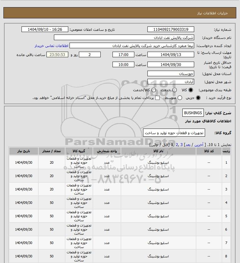| 5 | -- | اسلیو بوشینگ | عدد | تجهیزات و قطعات حوزه تولید و ساخت | 50 | 1404/09/30 |