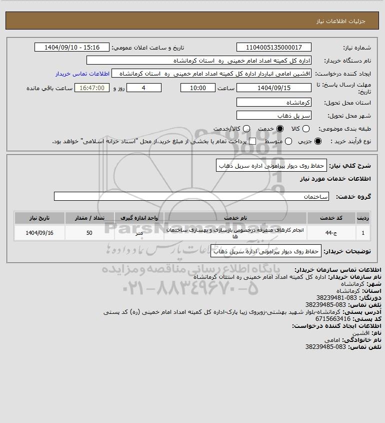 شرح کلی نیاز: حفاظ روی دیوار پیرامونی اداره سرپل ذهاب