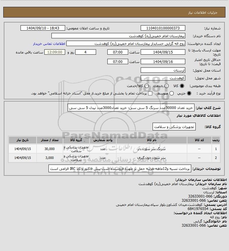 | 1 | -- | سرنگ سر سوزن دار | عدد | تجهیزات پزشکی و سلامت | 30,000 | 1404/09/15 |