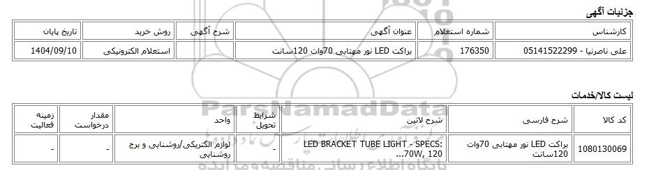 | علی ناصرنیا - 05141522299 | 176350 | براکت LED نور مهتابی 70وات 120سانت | استعلام الکترونیکی | 1404/09/10 |