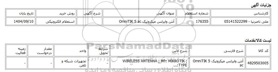 | علی ناصرنیا - 05141522299 | 176355 | آنتن وایرلس میکروتیک OmniTIK 5 ac | استعلام الکترونیکی | 1404/09/10 |
