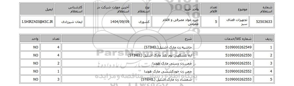 | 52503633 | تجهیزات فضای سبز | 5 | خرید مواد مصرفی و اقلام عمومی | کشوری | 1404/09/09 | ایمان شیرزادی | I.SHIRZADI@KSC.IR |