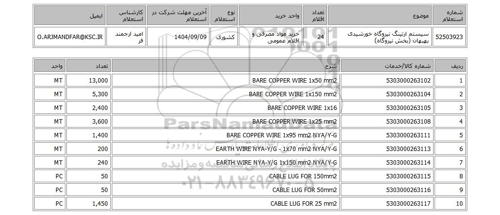 | 52503923 | سیستم ارتینگ نیروگاه خورشیدی بهبهان (بخش نیروگاه) | 24 | خرید مواد مصرفی و اقلام عمومی | کشوری | 1404/09/09 | امید ارجمند فر | O.ARJMANDFAR@KSC.IR |
