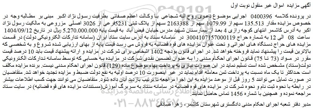 در پرونده کلاسه 0400396 اجرایی موضوع دعوی روح اله شجاعی با وکالت اعظم صفائی بطرفیت رسول نژاد اکبر مبنی بر مطالبه وجه در خصوص مزایده مقدار 135.513 سهم از 1079.99 سهم از 2163388 سهم از پلاک ثبتی 5231فرعی از 3026 اصلی مزروعی به مالکیت رسول نژاد اکبر به آدرس کاشمر انتهای کوچه رازی 4 بعد از بیمارستان شهید مدرس خیابان فیض آباد به قیمت پایه 5.270.000.000 ریال در تاریخ 1404/09/12 ساعت 08 الی 12 به شماره حراج 3004107157000119 در سامانه ستاد به آدرس سایت ستاد ایران (سامانه تدارکات الکترونیکی دولت) در قسمت مزایده های حراج دستگاه های اجرائی و تحت عنوان مزایده های قوه قضائیه به فروش می رسد قیمت پایه از بهای ارزیابی شده شروع و به شخصی که بالاترین قیمت را پیشنهاد نماید فروخته خواهد شد. در اجرای قانون بودجه 1402 اشخاص برای شرکت در مزایده و ارائه پیشنهاد قیمت باید 10 درصد قیمت مقرر در مواد (73 تا 75) قانون اجرای احکام مدنی را به عنوان تضمین نقدی شرکت در مزایده به حسابی که توسط سامانه تدارکات الکترونیکی دولت(ستاد) مشخص شده است تسلیم نماید در این صورت نیازی به پرداخت بهاء موضوع ماده (129) قانون اجرای احکام مدنی نیست. برنده مزایده مکلف است حداکثر تا یک ماه نسبت به پرداخت ثمن معامله اقدام نماید در غیر اینصورت 10 درصد اولیه به نفع دولت ضبط و مزایده تجدید خواهد شد. متقاضیان در صورت تمایل می توانند 5 روز قبل از موعد مزایده به این اجرا مراجعه تا ترتیب بازدید آنان داده شود. متقاضیان می توانند جهت کسب اطلاعات بیشتر در رابطه با نحوه ثبت نام و نحوه شرکت در مزایده های قوه قضائیه در سامانه ستاد به سربرگ آموزش(مستندات مزایده های قوه قضائیه) در سایت ستاد مراجعه نموده و همچنین با شماره 1456 تماس حاصل نمایند.