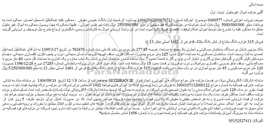 مزایده از ساعت 8 تا 12 تاریخ 1404/09/24 در سامانه ستاد به نشانی سایت ستاد ایران سامانه تدارکات الکترونیکی دولت در قسمت مزایده های حراج دستگاه های اجرایی و تحت عنوان مزایده های قوه قضائیه به شماره حراج 3004107132000122 به فروش می رسد توضیح اینکه در اجرای قانون بودجه 1402 اشخاص برای شرکت در مزایده و ارائه پیشنهاد قیمت باید ده درصد قیمت مقرر در ماده 129 قانون اجرای احکام مدنی را به عنوان تضمین نقدی شرکت در مزایده به حسابی که توسط سامانه تدارکات الکترونیکی دولت (ستاد) مشخص شده است تسلیم نماید و برنده مزایده مکلف است حداکثر ظرف مدت یک ماه نسبت به پرداخت باقیمانده ثمن معامله اقدام نماید و در صورت عدم پرداخت در موعد مقرر ، ده درصد اولیه به نفع دولت ضبط و مزایده تجدید خواهد شد . مزایده از قیمت ارزیابی شده شروع و به هر شخص حقیقی یا حقوقی که بالاترین قیمت را پیشنهاد نماید فروخته خواهد. بدیهی است که در صورت تمایل برای بازدید ظرف 5 روز قبل از مزایده به این اجرا احکام مدنی مراجعه تا با درخواست ایشان نسبت به بازدید آنان از اموال مورد مزایده اقدام گردد . هزینه های تنظیم سند و نقل و انتقال مطابق با مقررات و رویه قضایی و بدهی های معوق به عهده فروشنده و تخلیه تابع مقررات قانونی بوده و ارتباطی به این اجرا ندارد . ضمنا برای کسب اطلاعات بیشتر در رابطه با نحوه ثبت نام و نحوه شرکت در مزایدهای قوه قضائیه در سامانه ستاد به سربرگ آموزش (مستندات مزایده های قوه قضائیه ) مراجعه نموده و یا با شماره 1456 تماس حاصل نمایند%