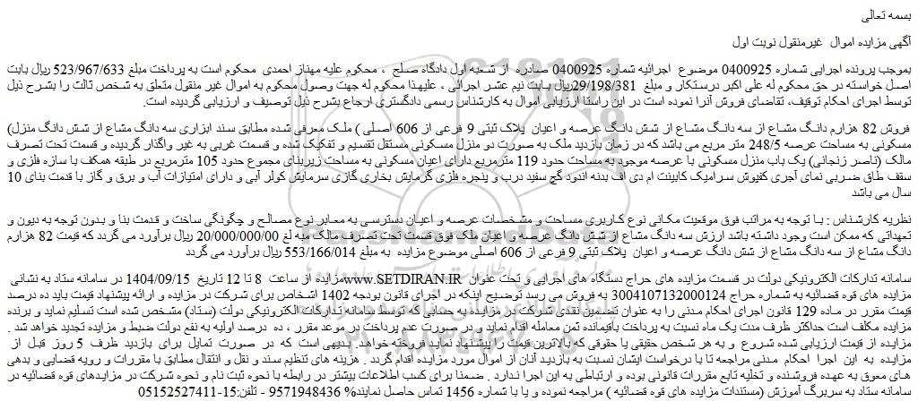بموجب پرونده اجرایی شماره 0400925 موضوع  اجرائیه شماره 0400925 صادره  از شعبه اول دادگاه صلح  ، محکوم علیه مهناز احمدی  محکوم است به پرداخت مبلغ 523/967/633 ریال بابت اصل خواسته در حق محکوم له علی اکبر درستکار و مبلغ  29/198/381ریال بابت نیم عشر اجرائی ، علیهذا محکوم له جهت وصول محکوم به اموال غیر منقول متعلق به شخص ثالث را بشرح ذیل توسط اجرای احکام توقیف، تقاضای فروش آنرا نموده است در این راستا ارزیابی اموال به کارشناس رسمی دادگستری ارجاع بشرح ذیل توصیف و ارزیابی گردیده است.