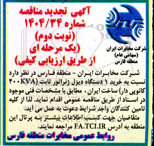 شرکت مخابرات ایران - منطقه فارس در نظر دارد نسبت به خرید یک دستگاه دیزل ژنراتور ثابت ( 400kva کانوپی دار) ساخت ایران مطابق با مشخصات فنی موجود در اسناد از طریق مناقصه عمومی اقدام نماید .
