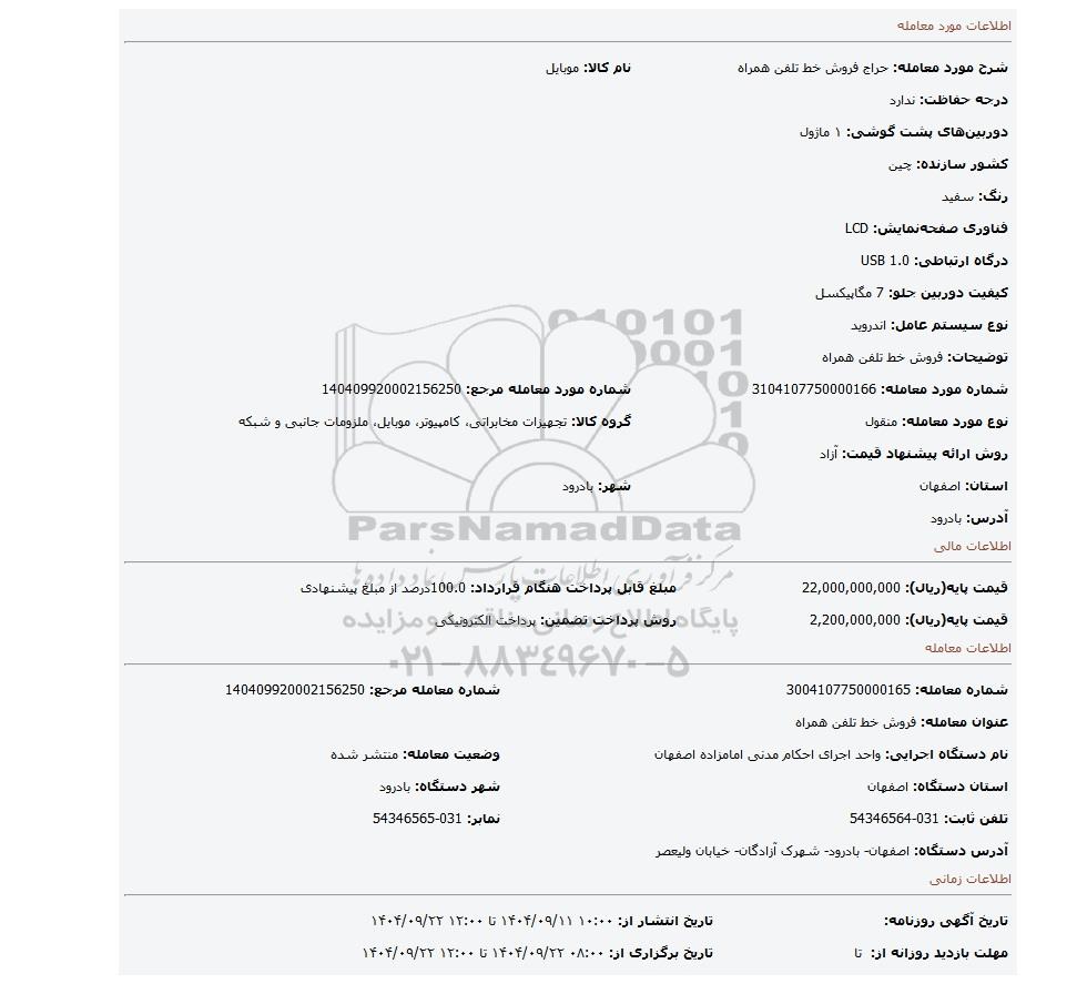| شماره مورد معامله: 3104107750000166 | شماره مورد معامله مرجع: 140409920002156250 | |