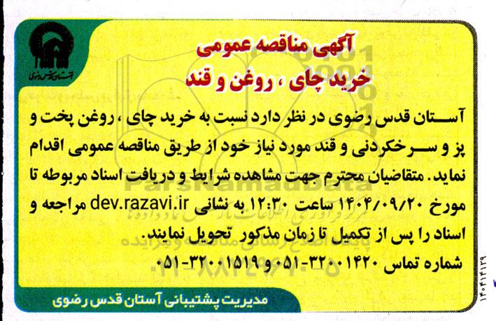 آستان قدس رضوی در نظر دارد نسبت به خرید چای ، روغن پخت و پز و سرخکردنی و قند مورد نیاز خود از طریق مناقصه عمومی اقدام نماید. متقاضیان محترم جهت مشاهده شرایط و دریافت اسناد مربوطه تا تاریخ 1404.9.20 ساعت 12.30 به نشانی dev.razavi.ir مراجعه و اسناد را پس از تکمیل تا زمان مذکور تحویل نمایند.