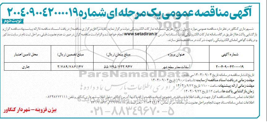 مناقصه عمومی آسفالت معابر سطح شهر - نوبت دوم از کلیه افراد متخصص و شرکتها واجد شرایط دعوت به عمل میآید در مناقصه با کد خبرگزاری پارس نماد: 9933091 شرکت نمایند.